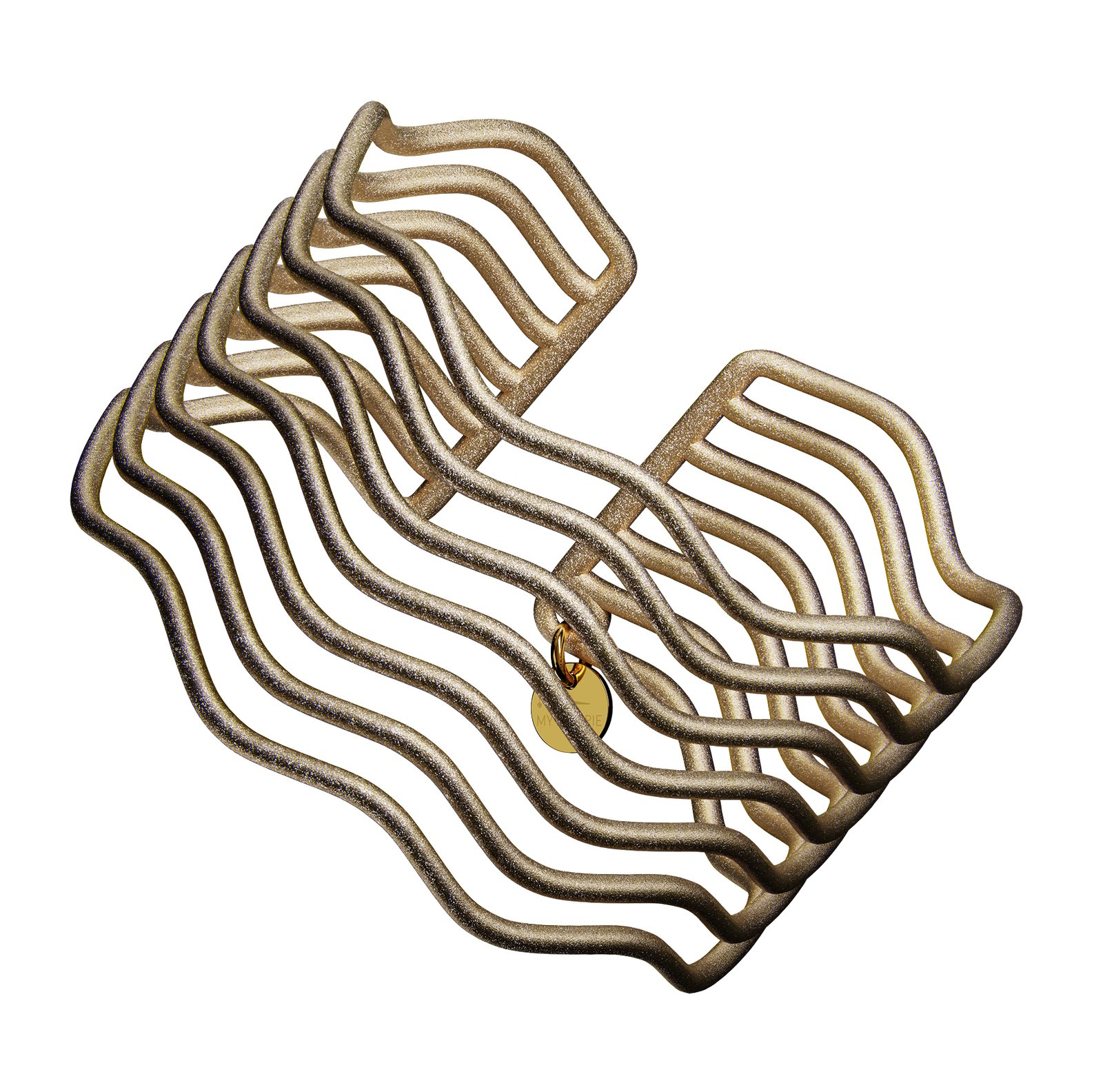 Der Armreif „RUEDIGER GLAMOUR“ mit gold-glänzender Spezialbeschichtung ist von einem unter Denkmalschutz stehenden Jugendstilwohnhaus, dem Rüdigerhof in Wien Margarten inspiriert. Das interessante Detail an diesem 1902 erbauten Gebäude ist der feine Wellenputz in der Sockelzone. Der Armreifen spielt genau mit diesem Gestaltungsmerkmal, sieben harmonische Wellen werden zum Eyecatcher am Handgelenk. Das markante Design und sein ausgesprochen angenehmes Tragegefühl machen den Polyamid Armreifen schnell zu einem liebgewonnen, täglichen Begleiter der problemlos auch während der Computerarbeit getragen werden kann und besonders am Abend für ein Highlight am Handgelenk sorgt.